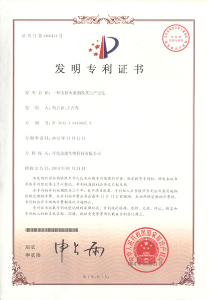 公司水產(chǎn)殺苔藻產(chǎn)品專利證書