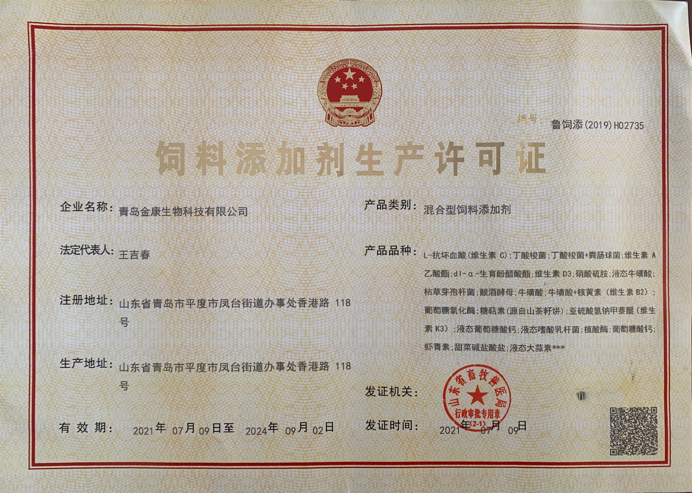 公司混合型飼料添加劑生產(chǎn)許可證
