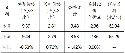 本周全國(guó)蛋料比價(jià)為3.48,環(huán)比下降1.42%。按目前價(jià)格及成本推算,未來(lái)蛋雞養(yǎng)殖每只盈利62.94元。